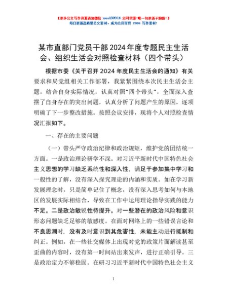 / 某市直部门党员干部2024年度专题民主生活会、组织生活会对照检查材料(四个带头)