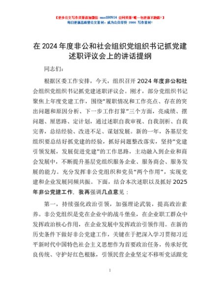 / 在2024年度非公和社会组织党组织书记抓党建述职评议会上的讲话提纲