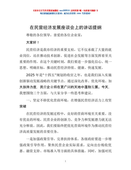 / 在民营经济发展座谈会上的讲话提纲