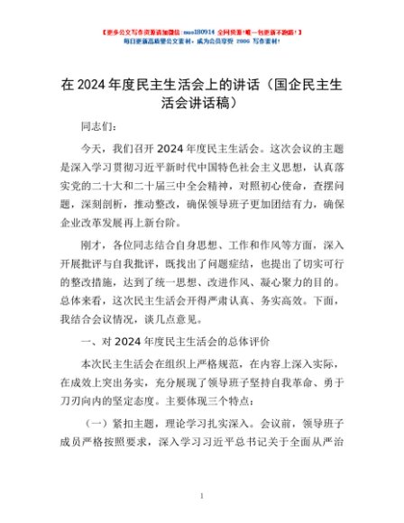 / 在2024年度民主生活会上的讲话(国企民主生活会讲话稿)