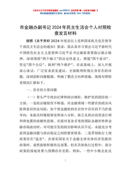 / 市金融办副书记2024年民主生活会个人对照检查发言材料