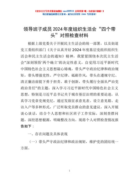 / 领导班子成员2024年度组织生活会“四个带头”对照检查材料