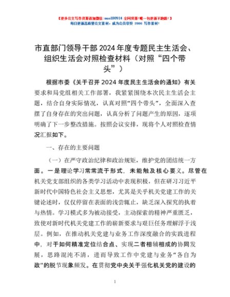 / 市直部门领导干部2024年度专题民主生活会、组织生活会对照检查材料(对照“四个带头”)