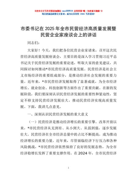 / 市委书记在2025年全市民营经济高质量发展暨民营企业家座谈会上的讲话