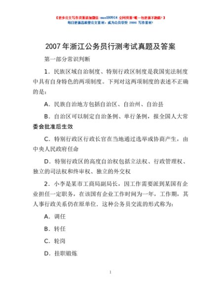 2007年浙江公务员行测考试真题及答案