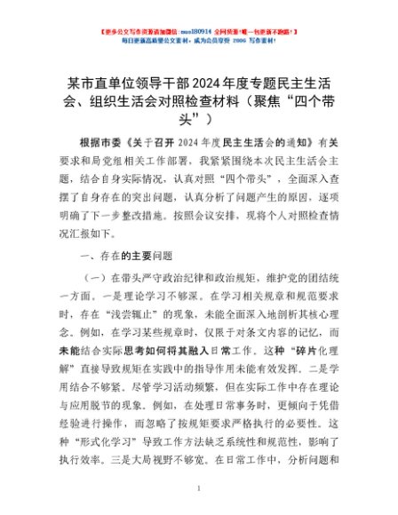/ 某市直单位领导干部2024年度专题民主生活会、组织生活会对照检查材料(聚焦“四个带头”)