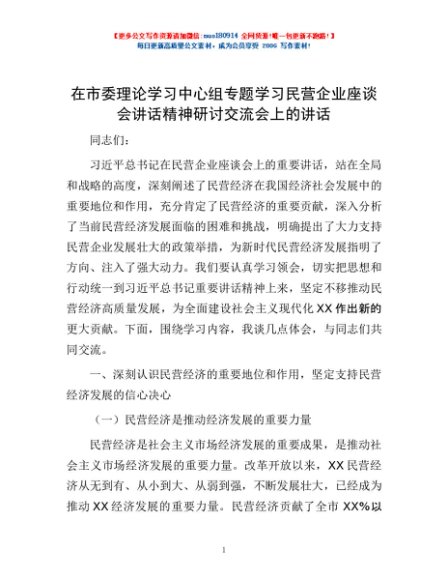 / 在市委理论学习中心组专题学习民营企业座谈会讲话精神研讨交流会上的讲话