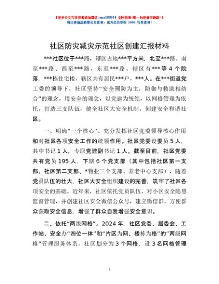 社区防灾减灾示范社区创建汇报材料