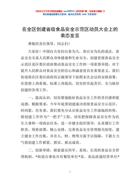 / 在全区创建省级食品安全示范区动员大会上的表态发言