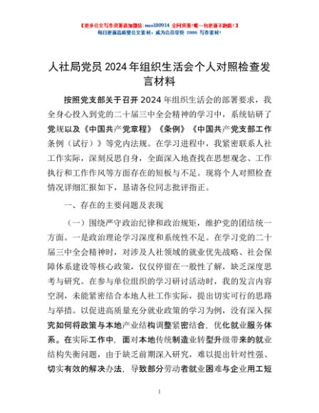 / 人社局党员2024年组织生活会个人对照检查发言材料