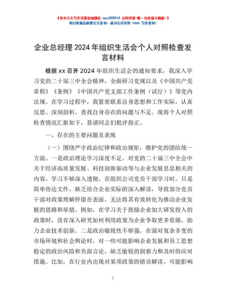 / 企业总经理2024年组织生活会个人对照检查发言材料