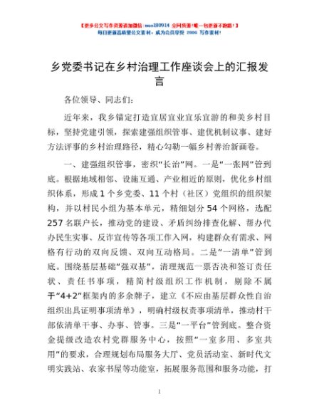 / 乡党委书记在乡村治理工作座谈会上的汇报发言