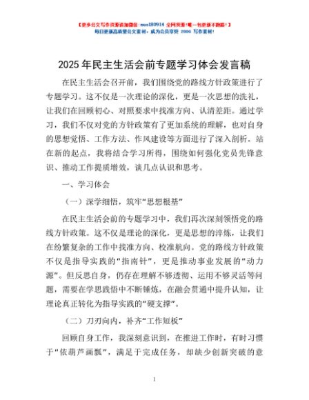 / 2025年民主生活会前专题学习体会发言稿