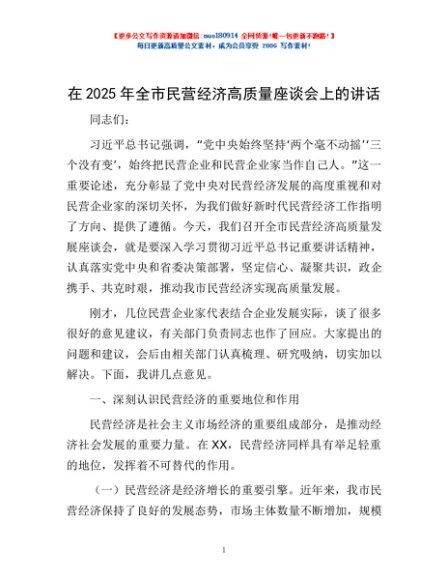 / 在2025年全市民营经济高质量座谈会上的讲话