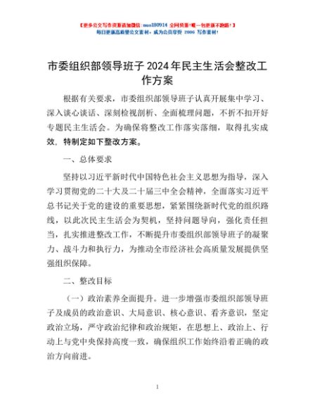 / 市委组织部领导班子2024年民主生活会整改工作方案