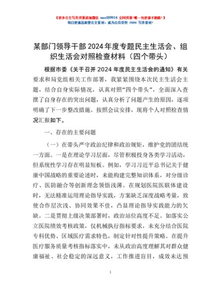 / 某部门领导干部2024年度专题民主生活会、组织生活会对照检查材料(四个带头)