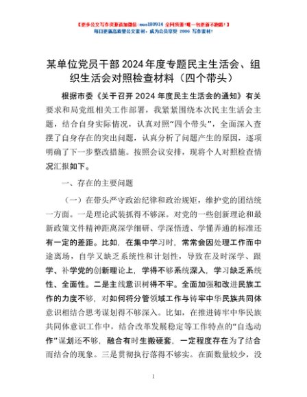 / 某单位党员干部2024年度专题民主生活会、组织生活会对照检查材料(四个带头)