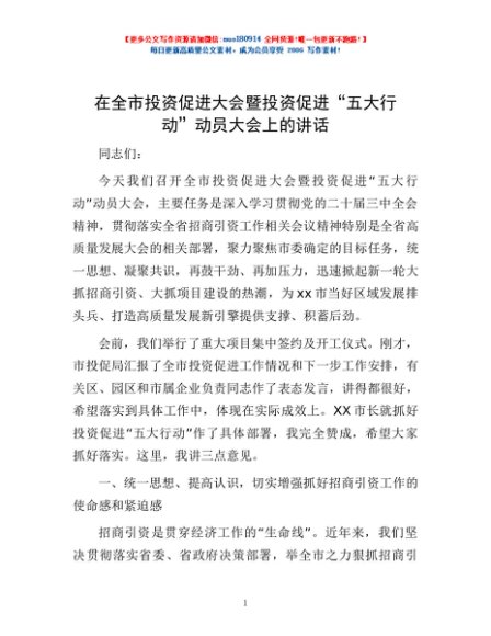 / 在全市投资促进大会暨投资促进“五大行动”动员大会上的讲话
