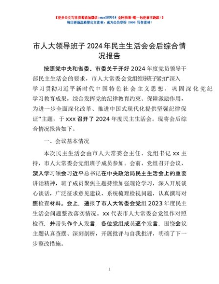 / 市人大领导班子2024年民主生活会会后综合情况报告