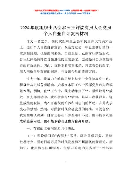 / 2024年度组织生活会和民主评议党员大会党员个人自查自评发言材料