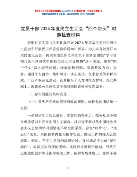 / 党员干部2024年度民主生活会“四个带头”对照检查材料