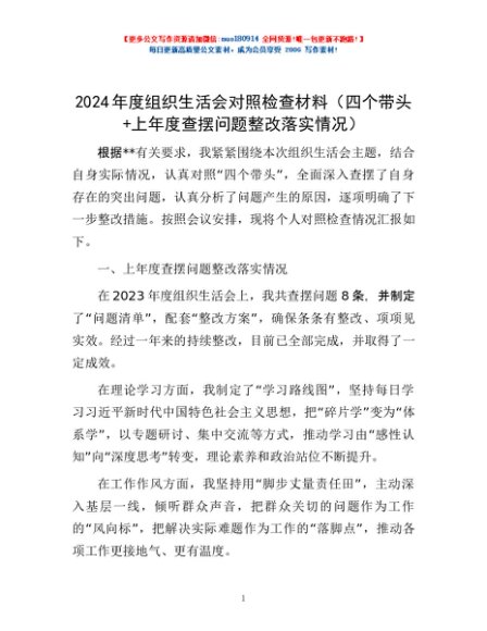 / 2024年度组织生活会对照检查材料(四个带头+上年度查摆问题整改落实情况)