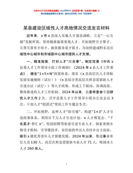 / 某县建设区域性人才高地情况交流发言材料