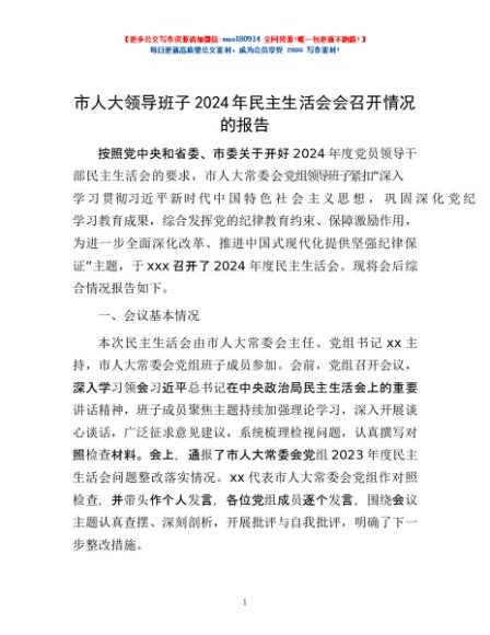 / 市人大领导班子2024年民主生活会会召开情况的报告