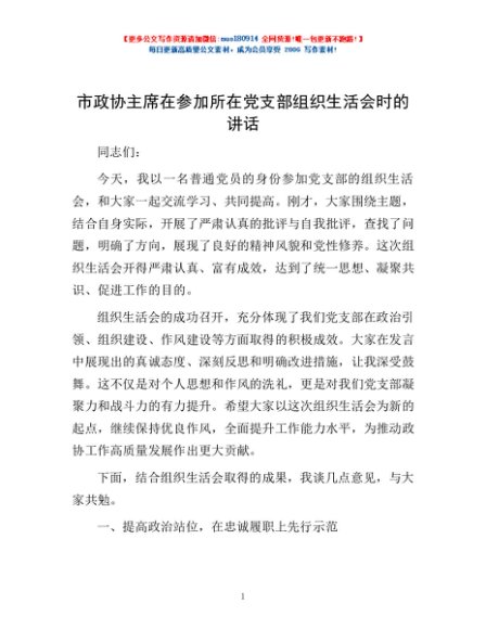 / 市政协主席在参加所在党支部组织生活会时的讲话