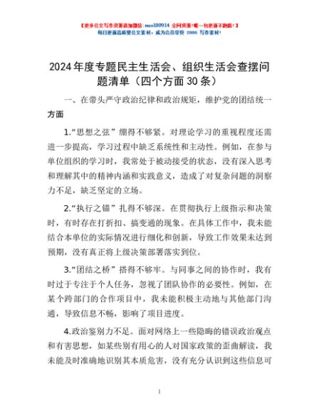 / 2024年度专题民主生活会、组织生活会查摆问题清单(四个方面30条)