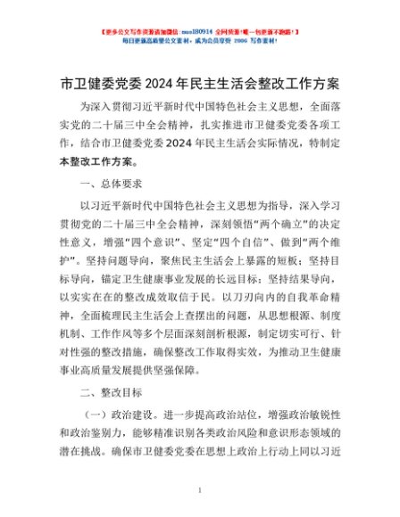 / 市卫健委党委2024年民主生活会整改工作方案