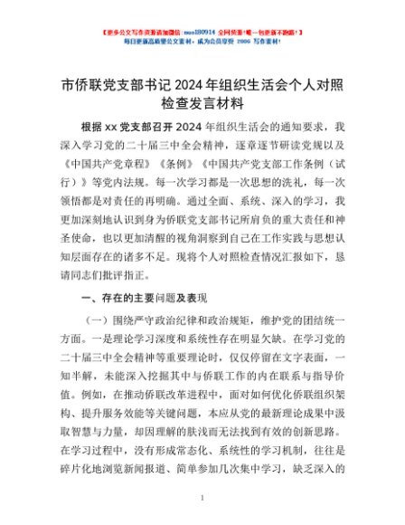 / 市侨联党支部书记2024年组织生活会个人对照检查发言材料