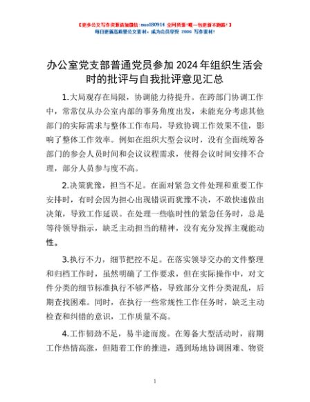 / 办公室党支部普通党员参加2024年组织生活会时的批评与自我批评意见汇总