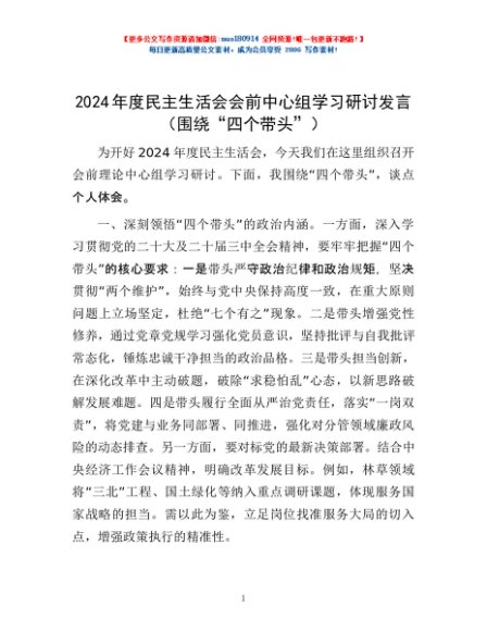 / 2024年度民主生活会会前中心组学习研讨发言(围绕“四个带头”)