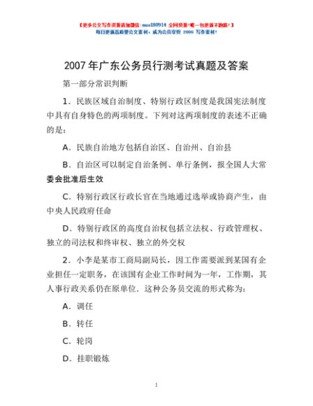 2007年广东公务员行测考试真题及答案