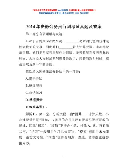 / 2014年安徽公务员行测考试真题及答案