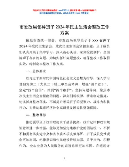 / 市发改局领导班子2024年民主生活会整改工作方案