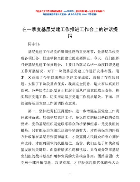 / 在一季度基层党建工作推进工作会上的讲话提纲