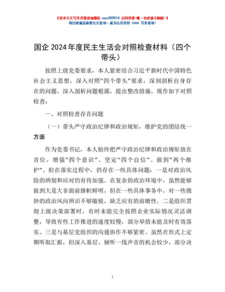 / 国企2024年度民主生活会对照检查材料(四个带头)