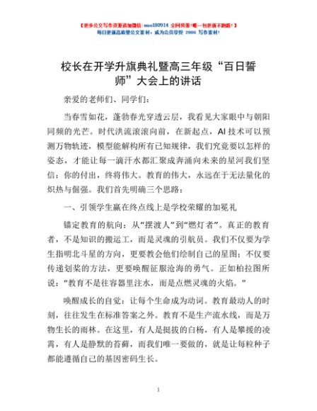 / 校长在开学升旗典礼暨高三年级“百日誓师”大会上的讲话