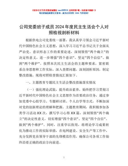 / 公司党委班子成员2024年度民主生活会个人对照检视剖析材料