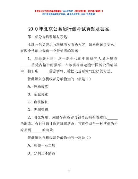 2010年北京公务员行测考试真题及答案