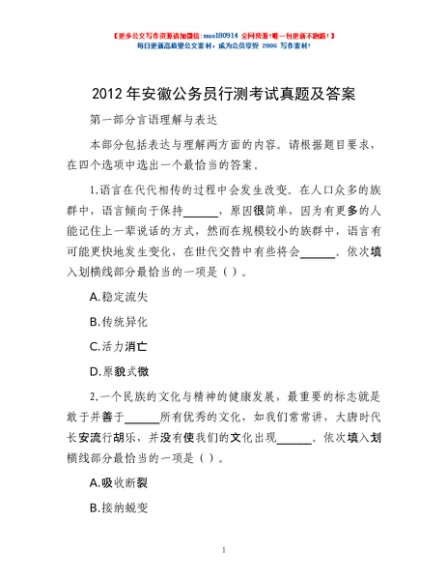 / 2012年安徽公务员行测考试真题及答案