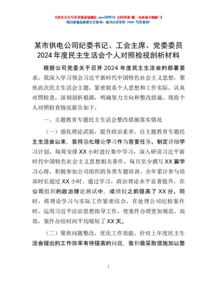 / 某市供电公司纪委书记、工会主席、党委委员2024年度民主生活会个人对照检视剖析材料