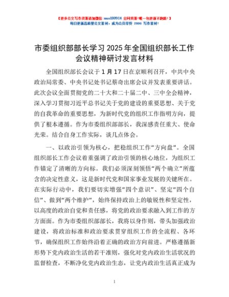 / 市委组织部部长学习2025年全国组织部长工作会议精神研讨发言材料