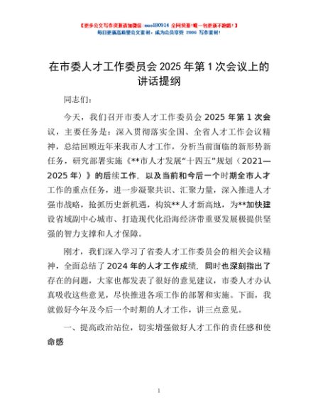 / 在市委人才工作委员会2025年第1次会议上的讲话提纲