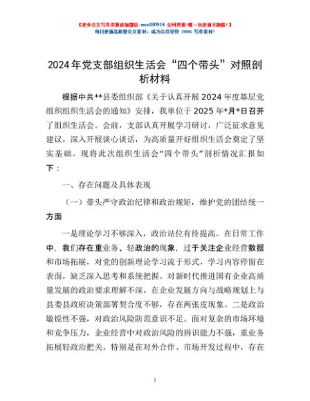 / 2024年党支部组织生活会“四个带头”对照剖析材料