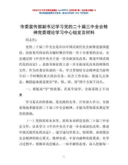 / 市委宣传部副书记学习党的二十届三中全会精神党委理论学习中心组发言材料