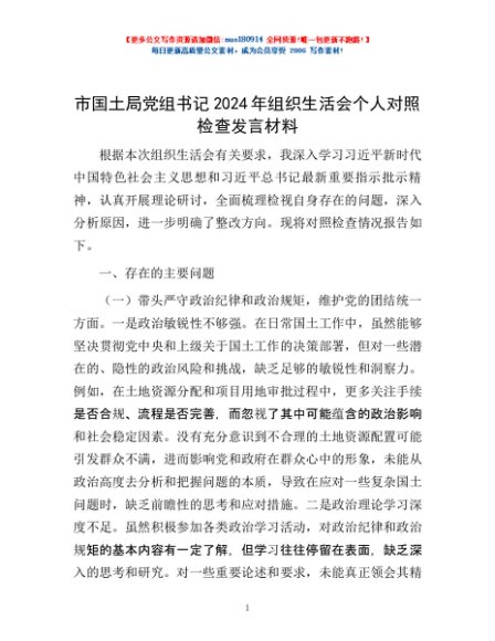 / 市国土局党组书记2024年组织生活会个人对照检查发言材料