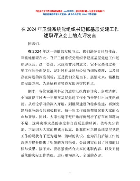/ 在2024年卫健系统党组织书记抓基层党建工作述职评议会上的点评发言